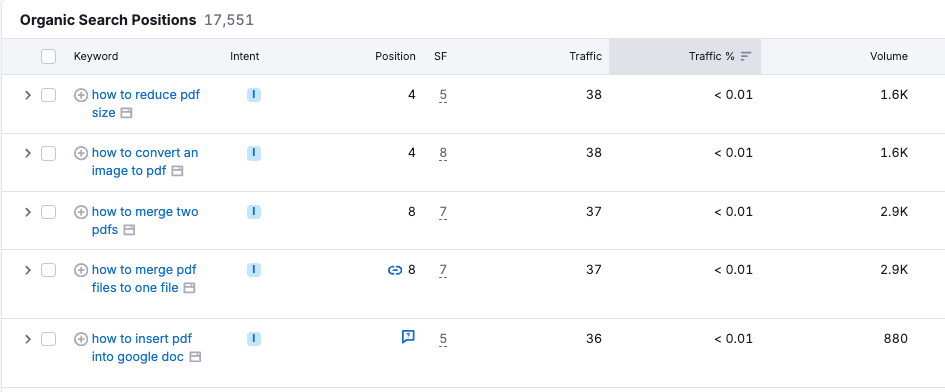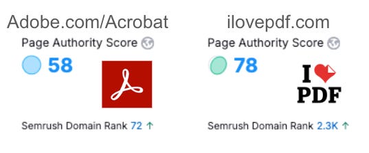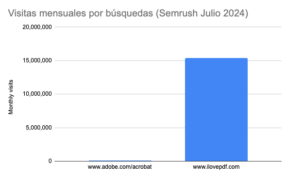 I Love PDF encontró que los usuarios buscaban una herramienta para combinar PDFs (merge PDF), y desarrolló su sitio alrededor de esa palabra clave. I Love PDF recibe 27,000 visitas al mes de esas búsquedas contra 9,000 que recibe Adobe.