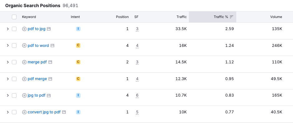 En muchas industrias, los clientes no buscan directamente lo que ofreces, pero puedes identificar potenciales clientes al comprender sus búsquedas relacionadas. I Love PDF, descubrió en su análisis que si bien pocos buscan “herramienta para manipular PDFs”, millones buscan “combinar pdf”, “pdf a jpg”, etc. Captar esos usuarios puede ser muy valioso para ellos.