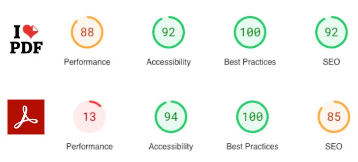 Nota como de acuerdo con Page Speed Insights I love PDF tiene mucho mejor velocidad de página (performance) y mejor optimización para SEO.